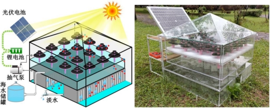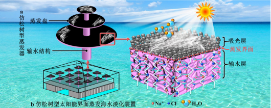 图2 仿松树型太阳能界面蒸发海水淡化装置结构示意图(左)和实物图(右)