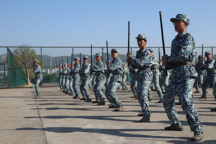 东方冉冉升起的太阳,为大地披上缕缕霞光。同学们已然准备好进行新一天的技能学习,承接昨日训练内容,他们对自己的目标已了然于胸,在教官带领下,分列式和警棍术方阵按计划展开训练。