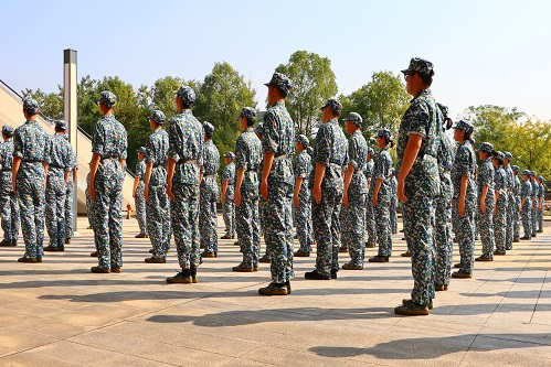 分列式方阵首先进行站军姿训练,之后则是进行正步的分解训练以及连贯训练和定腿训练,最后进行齐步走的踏步训练。“千里之堤,溃于蚁穴”,在训练中教官们精确到个人去纠正动作,以保证队伍走出来的动作统一、整齐而优美。
