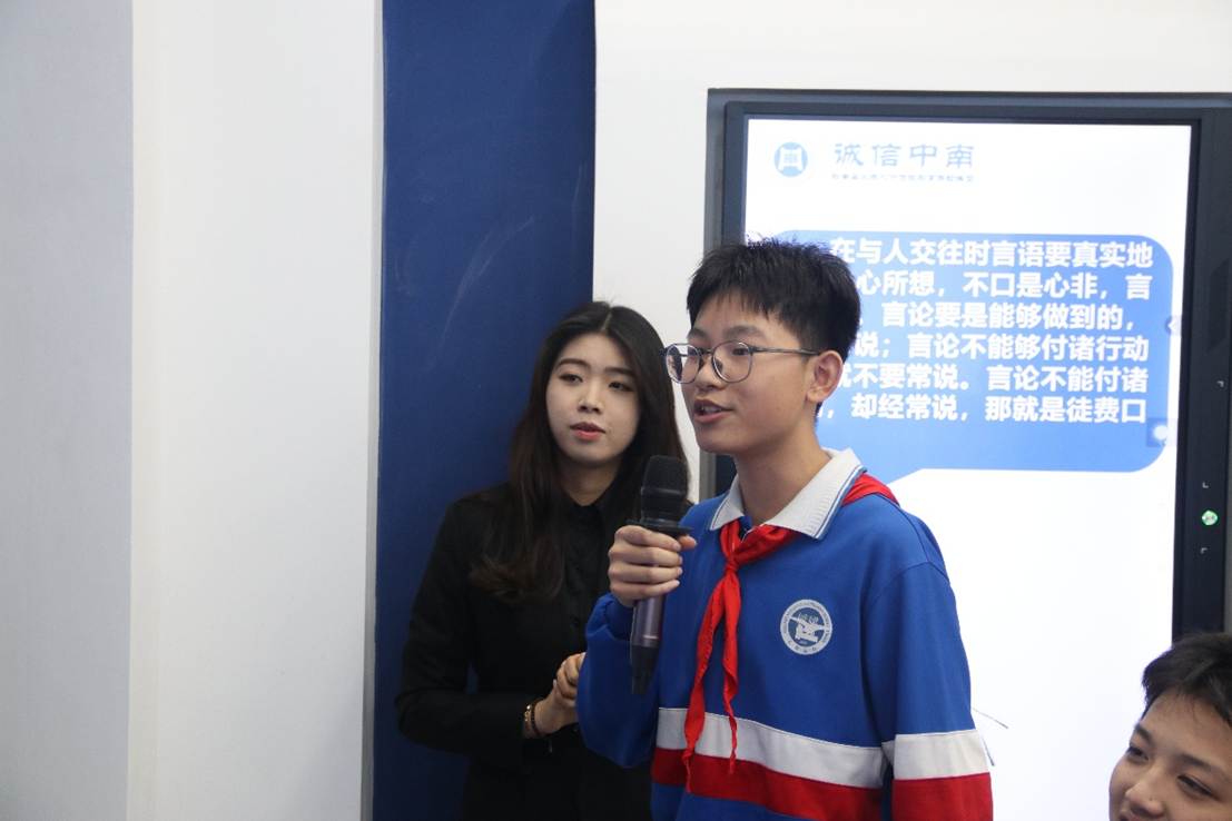 讲解员以古今中外有关诚信的 思考为例,揭示了诚信这一优良品质在日常生活的重要性,并让同学们举例日常生活中遇到的不诚信行为,教导同学们要对这些行为引以为戒。同学们踊跃发言,分享自己的见解,课堂气氛活跃。