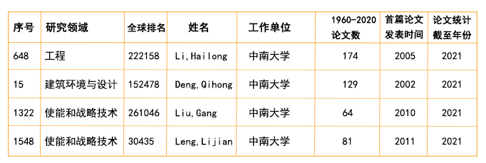 李海龙教授在工程领域国内上榜的1200名学者中排名第648位;邓启红教授在建筑环境与设计领域国内上榜的29名学者中排名第15位;刘刚副教授和冷立建教授在使能和战略技术领域国内上榜的1936名学者中分别排名第1322位和1548位。充分彰显了必威